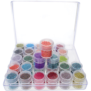 Great for storing beads and more! 6.4 in x 5.4 in. Clear Plastic Covered Storage Box with 30 - 1 in. x 1.1" Round Jars.